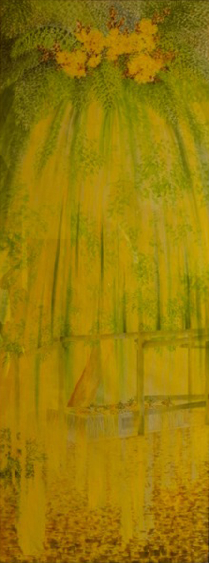 Samadhi under golden showers of the Service Tree blooms: Water-colour by Usha Patel