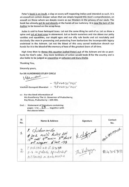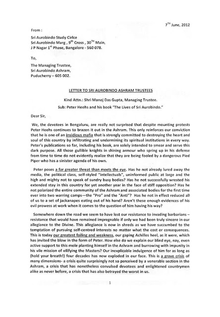 We, the devotees in Bengaluru, are really not surprised that despite mounting protests Peter Heehs continues to brazen it out in the Ashram. This only reinforces our conviction that he is one of an insidious mafia that is strongly committed to destroying the heart and soul of this country by infiltrating and undermining its spiritual institutions in every way. Peter’s publications so far, including his book, are solely intended to smear and serve this dark purpose. All those gullible knights in shining armour who spring up in his defense from time to time do not evidently realize that they are being fooled by a dangerous Pied Piper who has a sinister agenda of his own.